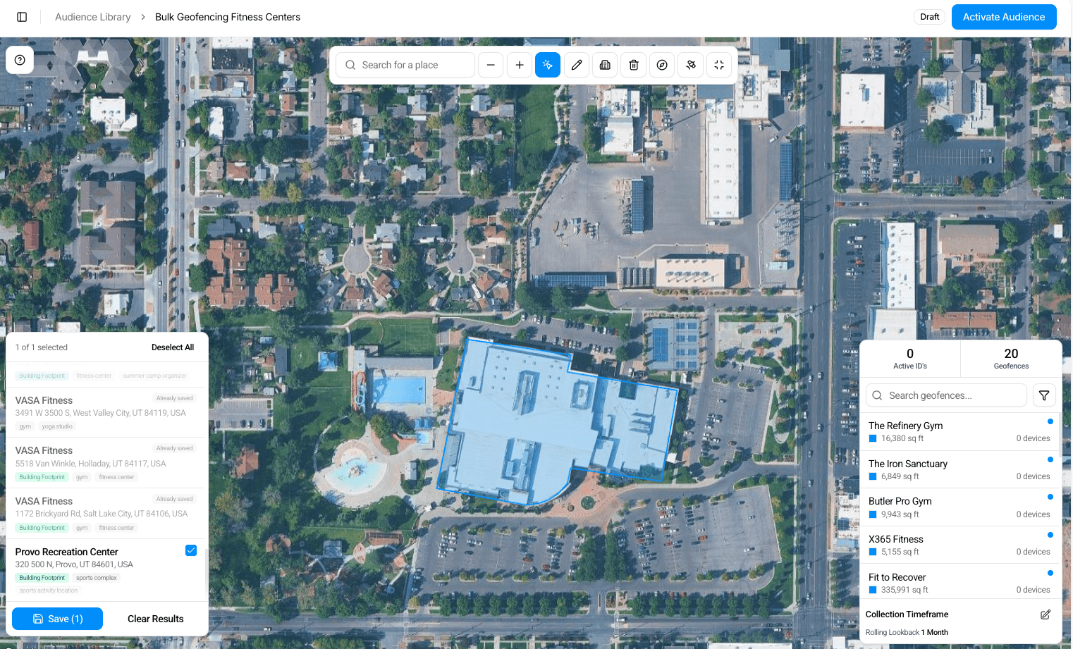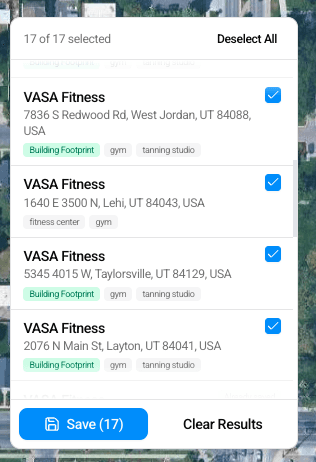 The platform searches for all relevant sites in that area and displays them on the map with building-level precision. You can review the results, select the ones that fit your targeting goals, and save them instantly as geofences.